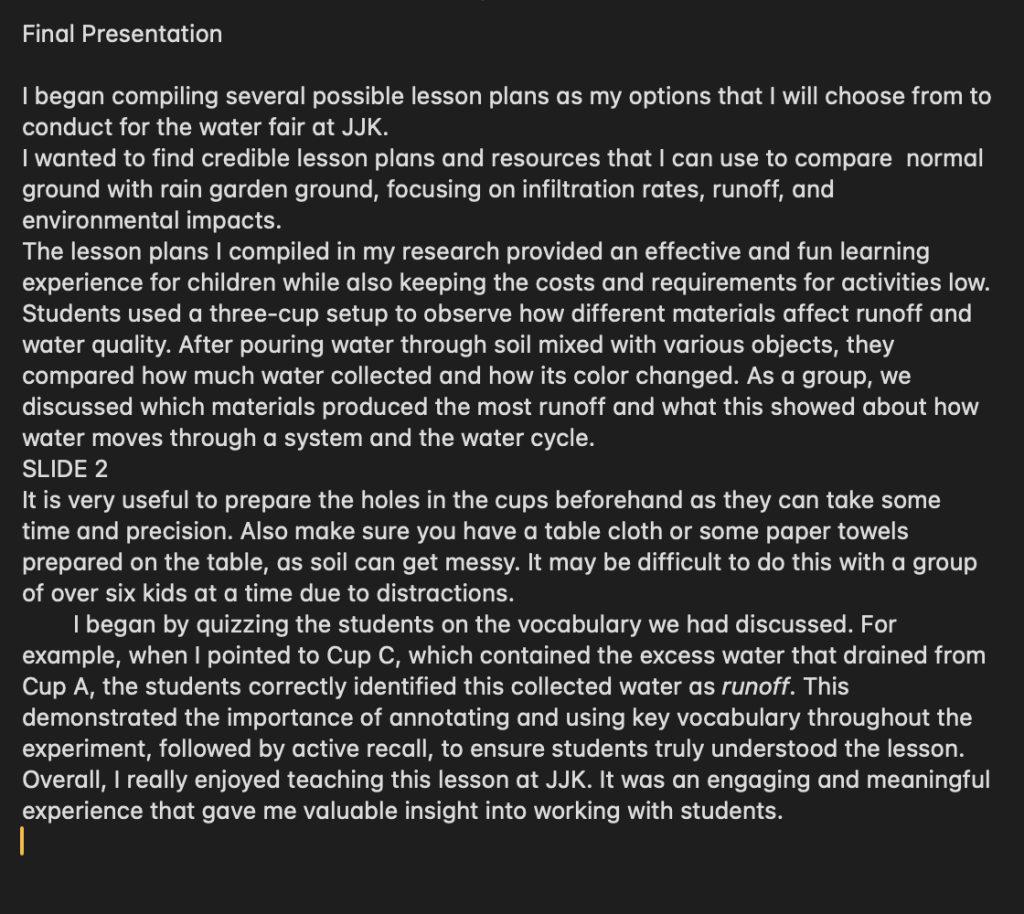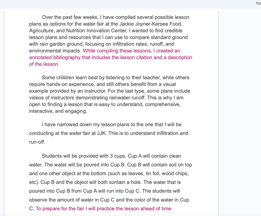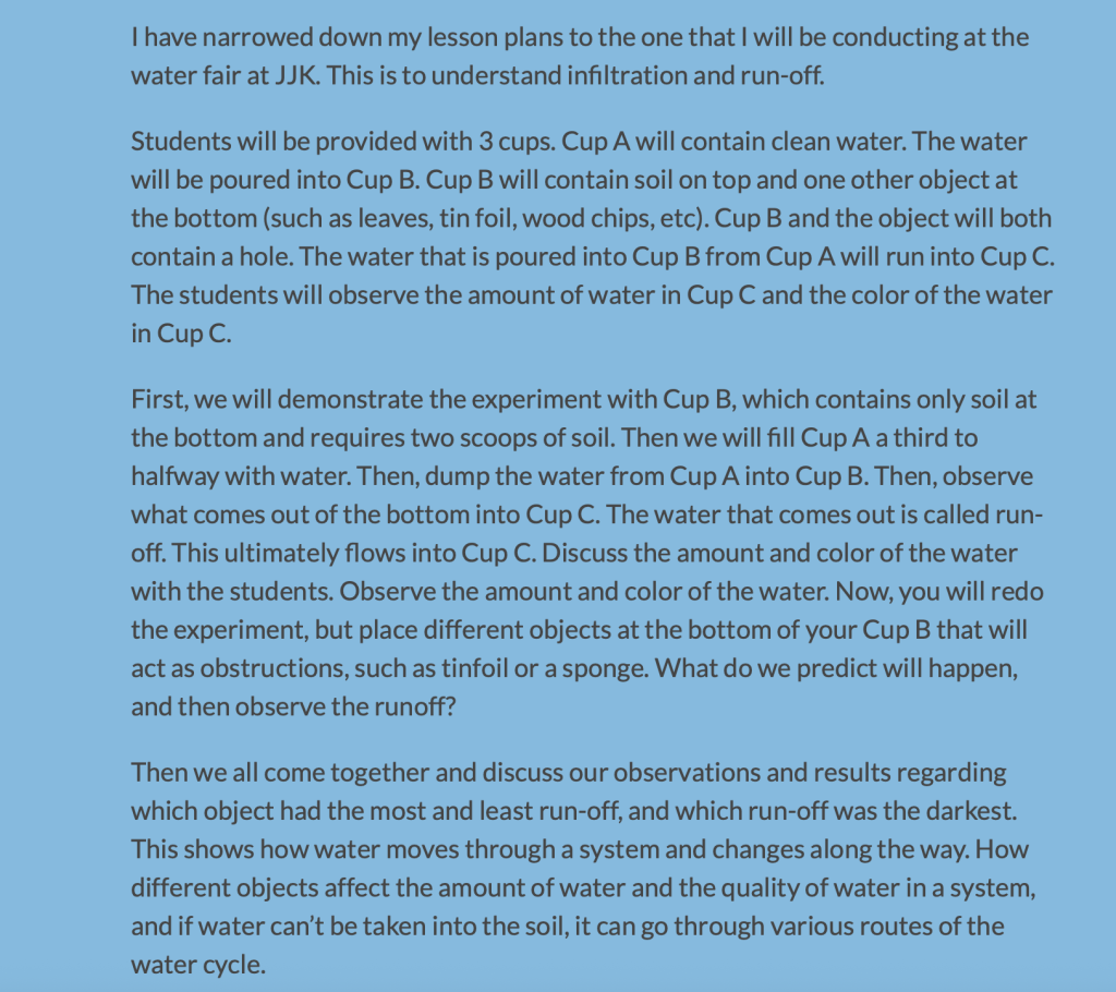 This is a screenshot of my reflection 3 where I talk about the lesson I ultimately chose, and I went back to my list of possible lesson plans to figure out which one would be the best to conduct at the water fair.