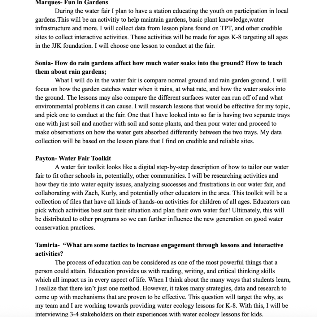 Reflecting on this past semester I learned a great amount of skills in this class. I have achieved all of my goals that I set for this semester, and I worked very hard to get to this point. These goals and new skills will help me through out college, in my future classes, internships, and jobs. I enjoyed all of the new experiences and challenges I encountered this semester and this will help me for the next two and a half years, medical school, and my future career. I will miss being in class with Dr. Martinez, she helped me a tremendous amount the entire way of my project; and was always very understanding, and overall an amazing professor. Conducting a lesson at the water fair was a great experience, I gained new knowledge regarding water conservation and youth education. I can’t wait to continue working on this topic next semester!