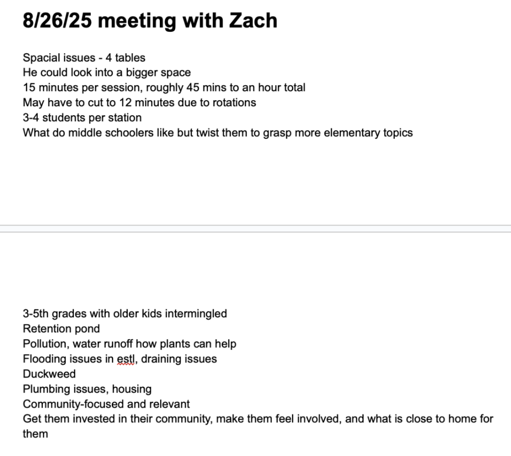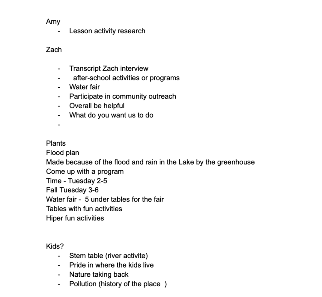 Here are my meeting notes which I referred to these a lot throughout my reflections and while researching lessons to conduct at the water fair.