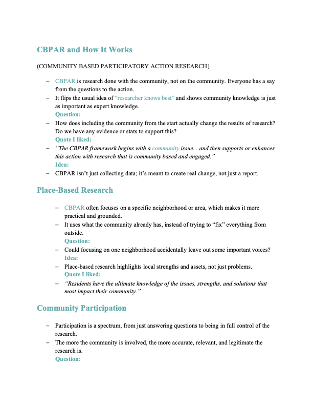 | I will explore research topics in depth, beyond assigned readings, to develop a richer understanding of the issue and improve my contributions to the project. | I will include: – Top 5 for a short guide to community-based participatory research – Summaries connecting extra research to project questions – Reflection entries showing how new knowledge changed my perspective – Annotated outlines showing integration of new information into project design | These examples demonstrate that I actively seek knowledge, reflect on what I learn, and apply it thoughtfully to strengthen both my research and personal growth. |