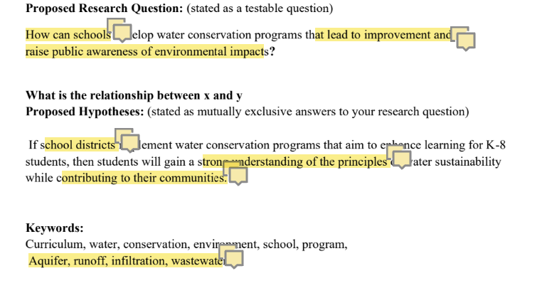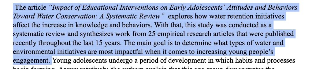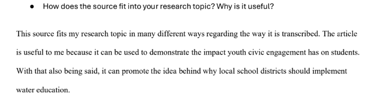My research question focuses on if K-8 students apply water conservation strategies at home. It can be said that the sources that I selected relate to the scope of my research because they each investigate different concepts of water literacy. For example, some of these articles examined the effort to implement water conservation education in schools, while some were measuring the outcomes after students received water conservation education. By creating a citation sheet, I was able to choose research that aligned with my focus. Along with this, I filter the articles by annotating them from Adobe PDF. Then, I was able to gauge which articles would provide effective evidence for what I’m to define. In summary, I was able to access information by annotating articles that fit my focus.