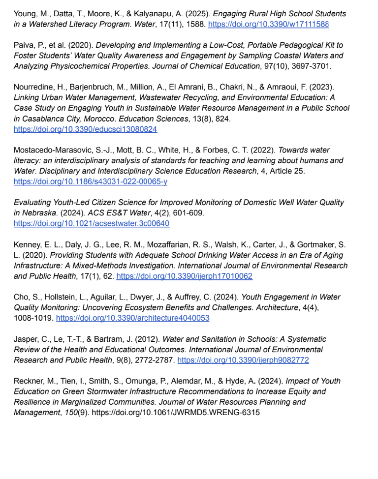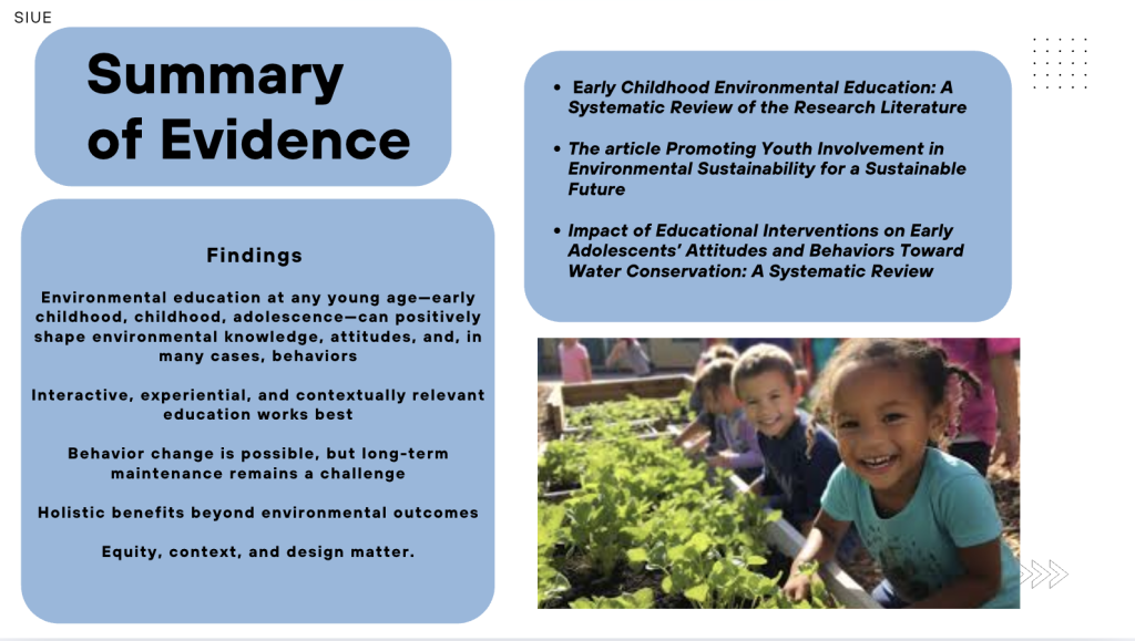 This slideshow summarized the scope of the research question because it demonstrated my understanding of water-conservation education exposure for elementary-aged students. Focusing on the gap in youth education on water sustainability practices, I was able to select sources that examine overarching findings and themes. Ultimately, the resources that I chose allowed me to effectively define the research as it regards all factors, solutions, and implications.
