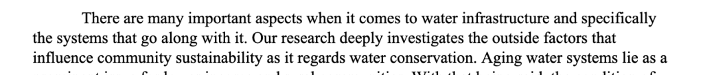 This section of my writing from the draft outline shows that I have accessed information effectively while being able to define the scope of research. In my writing I expand on systems that are aging and the impact that water conservation education would have for yonder adolescents. I also highlighted the importance of students learning water sustainability practices that are relatable to them. In conclusion, this section of my writing demonstrates effective information literacy as I define the scope and address challenges associated with relating factors such as water infrastructure.