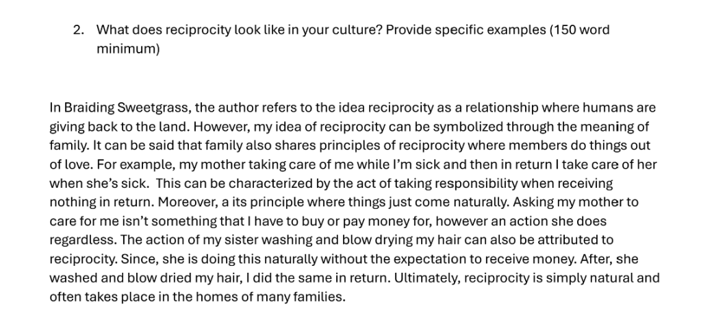 This reflection demonstrates my ability to express my own understanding of reciprocity by comparing it to the relationship that I share with my family. Moreover, the natural exchanges I have with family are compared to the natural exchanges Kimmerer has with the environment. Originally, I thought that the only reciprocal relationship one could have is with other people, such as family, but this bias has changed. Kimmerer’s examples of the reciprocal relationship that she has with the environment demonstrate that there are different perspectives and values associated with reciprocity. Ultimately, I was able to develop a complex understanding of indigenous culture while being able to assess my own biases.