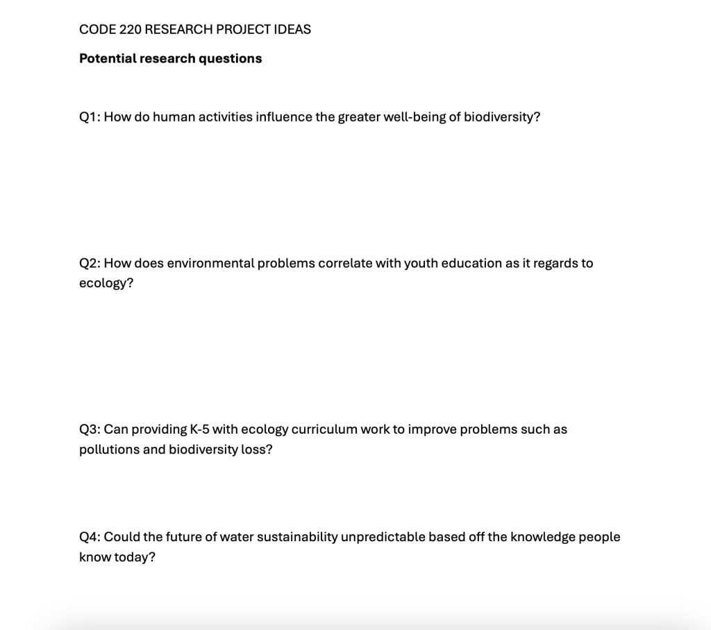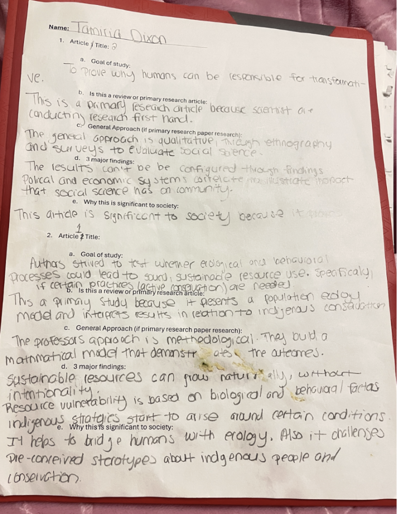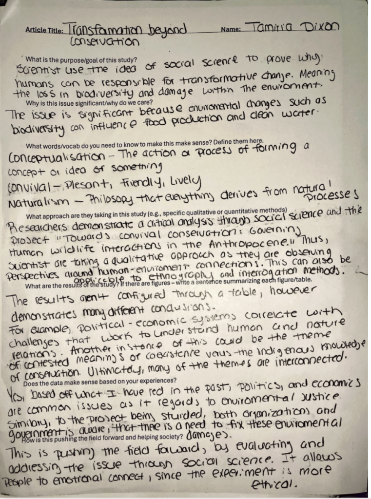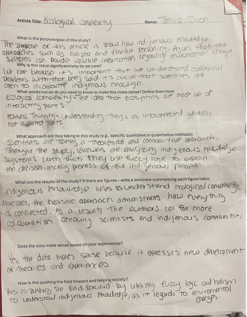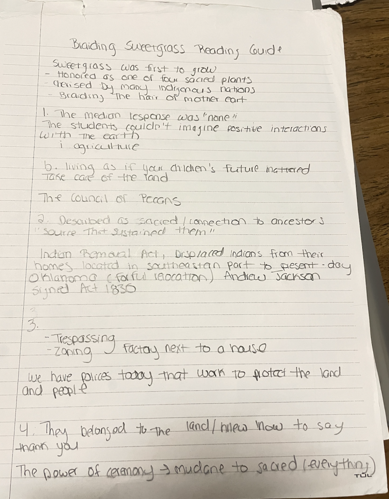 The “Braiding Sweetgrass” reading guides allowed me to develop a deeper understanding of Indigenous cultures regarding the values associated with them. Through the reading guide I was able to learn about the importance of reciprocity, gratitude, and sacredness. With that being said, I was able to further understand the importance indigenous knowledge has on the environment as it regards to conserving the environment. Ultimately, this example shows my dedication to understanding material outside of class while considering the implications of history and displacement when it comes to indigenous people.