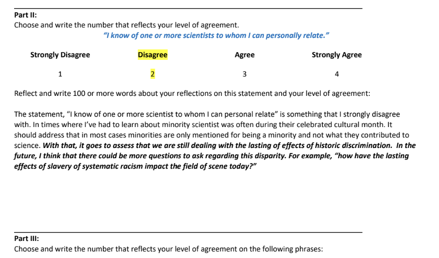 In this Reflection 1, I’m able to throughly reflect on my expereince as it reagards to sterotypes and biases. Through this excerpt I was able to explain the implications and history regarding systematic racism. In additon, I addressed the biases that others might have since African-Americans are poorly represented in the field. Conclusively, this excerpt demonstrates my ability to recognize biases while being able to understand the impact of scientific research.