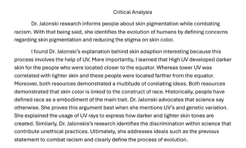 Dr. Jalonski’s research helped me understand the correlation of skin adaptation to recognizing the role this research has related to race construct. With that being said, I was able to identify how the concepts explained in the text that advocate for ethical research studies.