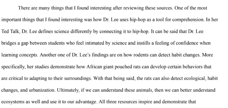 Dr. Lee’s hip-hop usage to teach science allowed me to reconnect with my own artistry. More importantly, this reflection allowed me to understand that lived experiences and cultural values are other ways to understand certain subjects, such as science. After reflecting, I learned that hip-hop has a greater benefit than just providing music for people. In conclusion, I demonstrated my ability to transform ideas while learning information that is innovative.