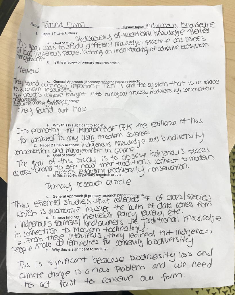 | Deeply considers factor and addresses all factors of topic Show understanding of topic by reflecting of new perspective | Indigenous Knowledge Jigsaw Sumary Draft Outline of Project Idea Scientist Spolight (Dr. Lee) | Approaches differently with new perspective Demonstrates engagement and ability to synthesize |