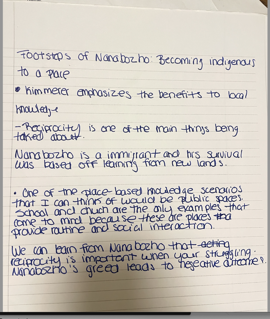 Here are a set of notes that I took during my study time. My notes demonstrates my critical thinking as it regards to the idea of reciprocity and the lessons that Nanabozho teaches us throughout the story.