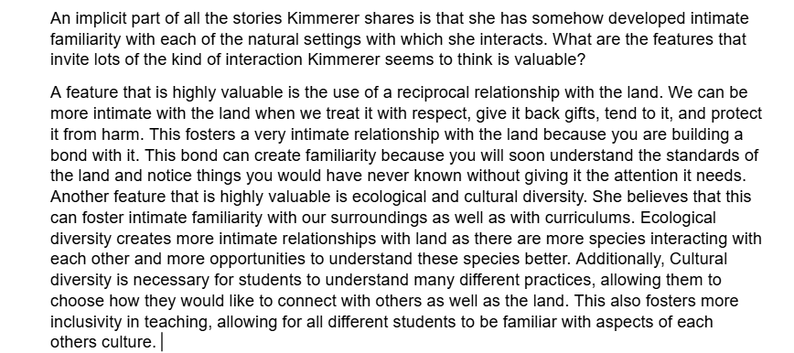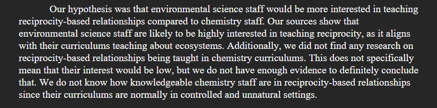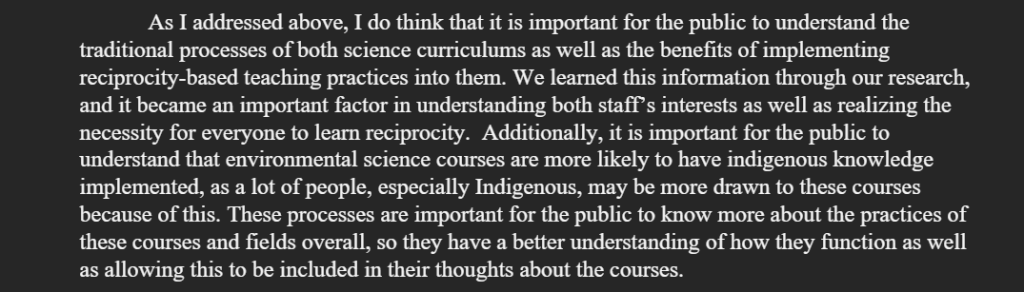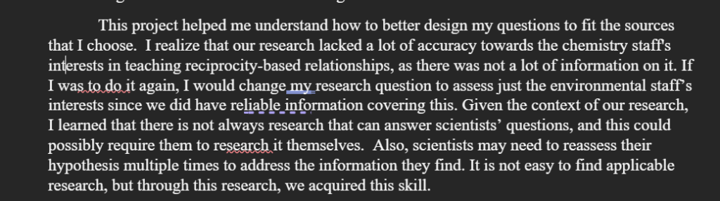 Above is an excerpt from my research paper analysis. This piece of evidence highlights my use of information literacy, as I was able to apply this journal article to my research question and understand what this tells me about Environmental Science staff’s interest in teaching reciprocity-based relationships.