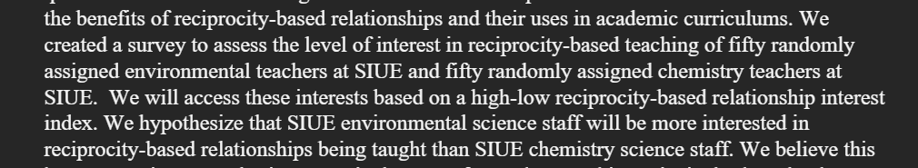 Above is an excerpt from my research paper from my summary of my proposed experiment. From my review of research, I additionally learned how important implementing reciprocity-based relationships is to the sustainable future of our Earth. I exemplified problem solving skills by being able to identify this from research and correlate this with our research for next steps required.