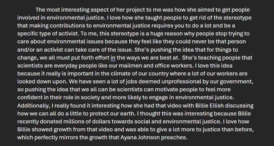Above is my Ayana Johnson scientist spotlight. I exemplified critical and creative thinking through reflecting on how she was redefining who scientists are by encouraging others to fight for environmental justice using the skills that they are good at. This shows me transforming her original ideas and making connections to other questions she did not address but inherently answered.