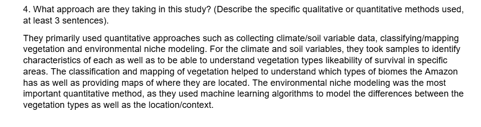 Above is an excerpt from my jigsaw #3 prep sheet. In this, I explained how the authors quantitative approaches helped them better understand the areas characteristics and vegetation types chance of survival depending on the environment, and how climate change has affected the areas. I exemplified quantitative literacy because I was able to figure out how the quantitative approaches led them to their conclusions and results.