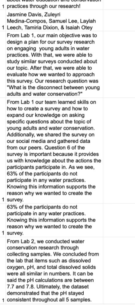| – Attend workshops – Seek information outside of classes – Be active on our GroupMe’s chat – Engange in hands-on projects | -Lab pictures -Pictures of my group while we’re working on our project – Interact with community partners | – Noticing I have a better understanding of our studies – More information being brought outside of class |